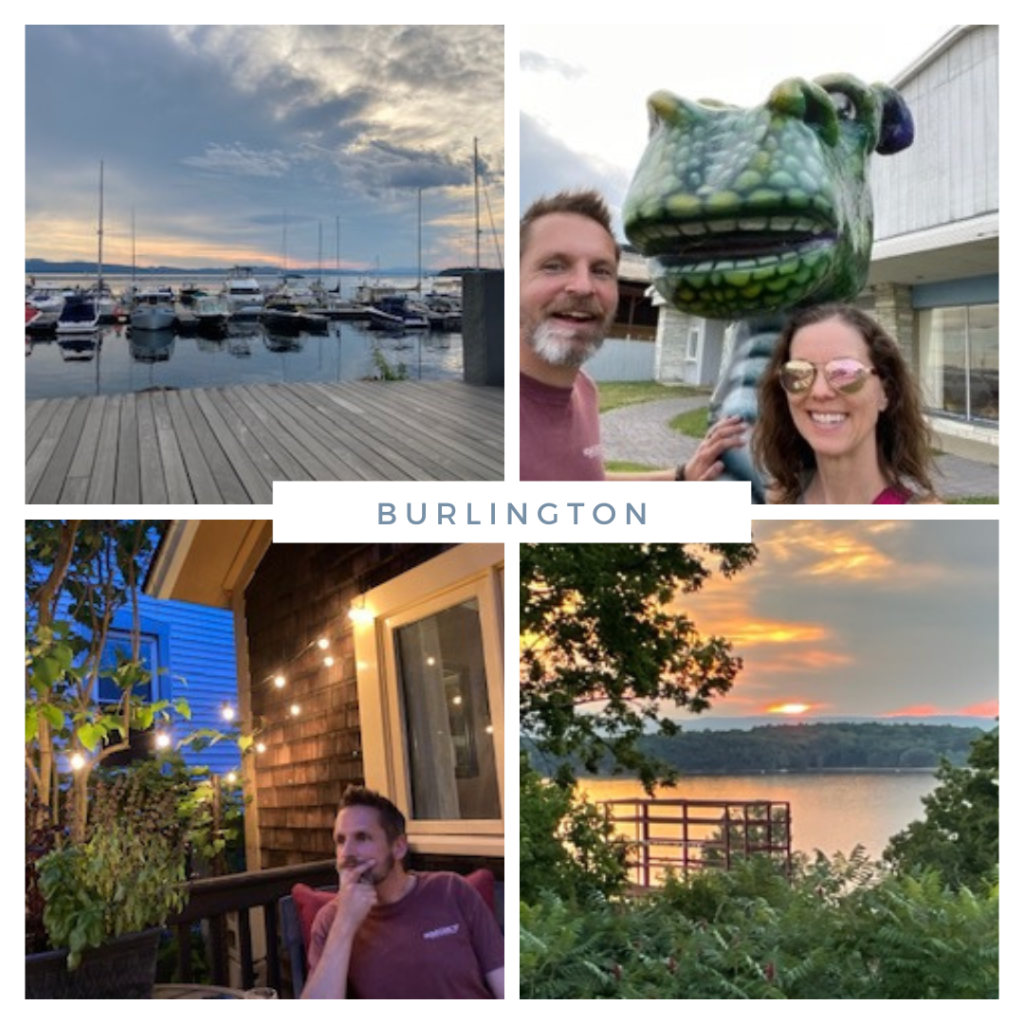 Tuesday, July 5, 2022: First full day in Burlington. John and I ran four miles on the Island Line Trail starting at Waterfront Park, then combined our runners’ high with caffeine at #KruCoffeeCollective; John got a (so-so) nitro cold brew and I got a (meh) latte made with soy milk (only because they didn’t have almond milk – what cafe doesn’t have almond milk?). For lunch I got a Hummdinger (amazing!) at #TopoftheBlockSandwichShop, and John got the Moroccan Maple Power Bowl (delicious!) at #Thorn+Roots.