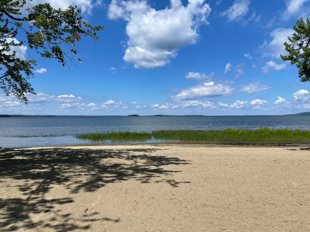 We finally arrived at Lake Carmi State Park, and the park employee reminded John not to leave food items out unattended, as there are raccoons and other opportunistic animals. We were horrified to discover that our site was adjacent to an unoccupied site that was trashed. There were three tents, one of which had been unzipped at the bottom and clothing was strewed about. There were trash bags hung in the trees, which was laughable, really. The picnic table was covered with red Solo cups, and there was about three feet of sticks with green foliage stacked on the fire pit. Surely, I thought, no one would light it like that; I was wrong. Our site was absolutely beautiful, though; a prime site right on the water. We were strategic about where to set up the tent. We wanted to create as much space as possible between us and this disaster. John really wanted to change sites, but we decided to stay put and see what would happen. In the meantime, while John and I were playing a game of Scrabble, the neighbors across from us came back from a swim. For about five hours we overheard a woman either yelling or swearing at her eight kids. I couldn’t help but think of how she treated these kids in the privacy of their home; we’re in a public place, for crying out loud. It made me feel sad and discouraged about humanity…