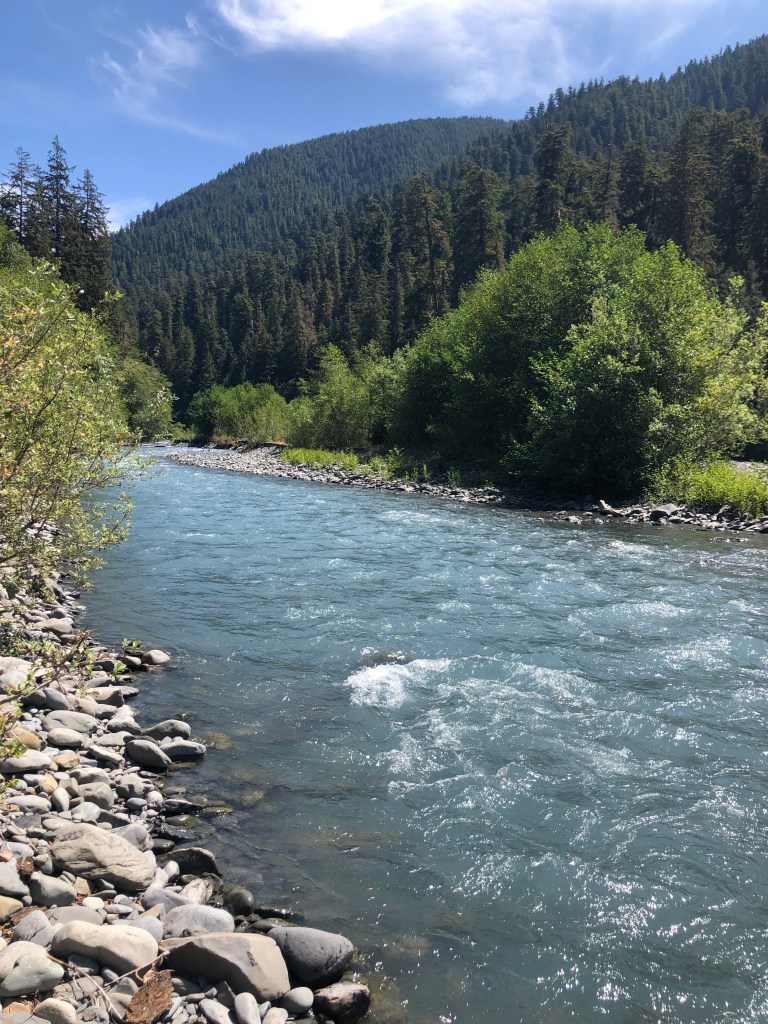 After the five of us completed the loop, John, Aspen and I got ready for a “hike” down the Hoh River Trail. It’s about 17 miles and ends at Glacier Meadows, but we only went 7.5 miles out and back to make it a 15-mile trip. It was a walk through beautiful forest with side paths that led to the teal-colored river.