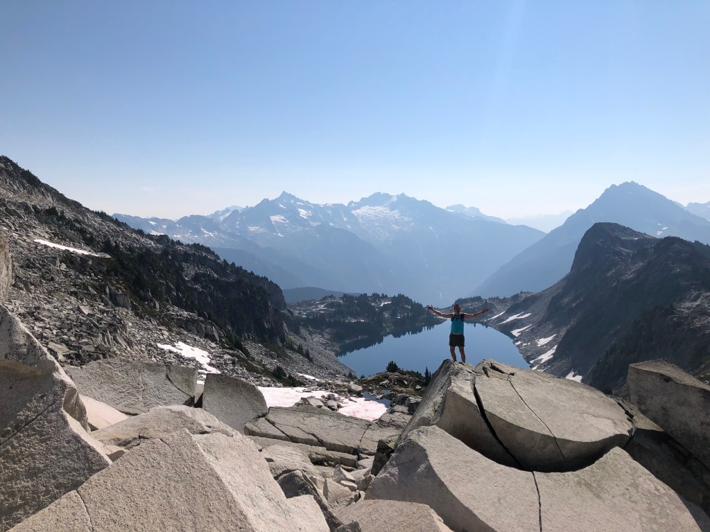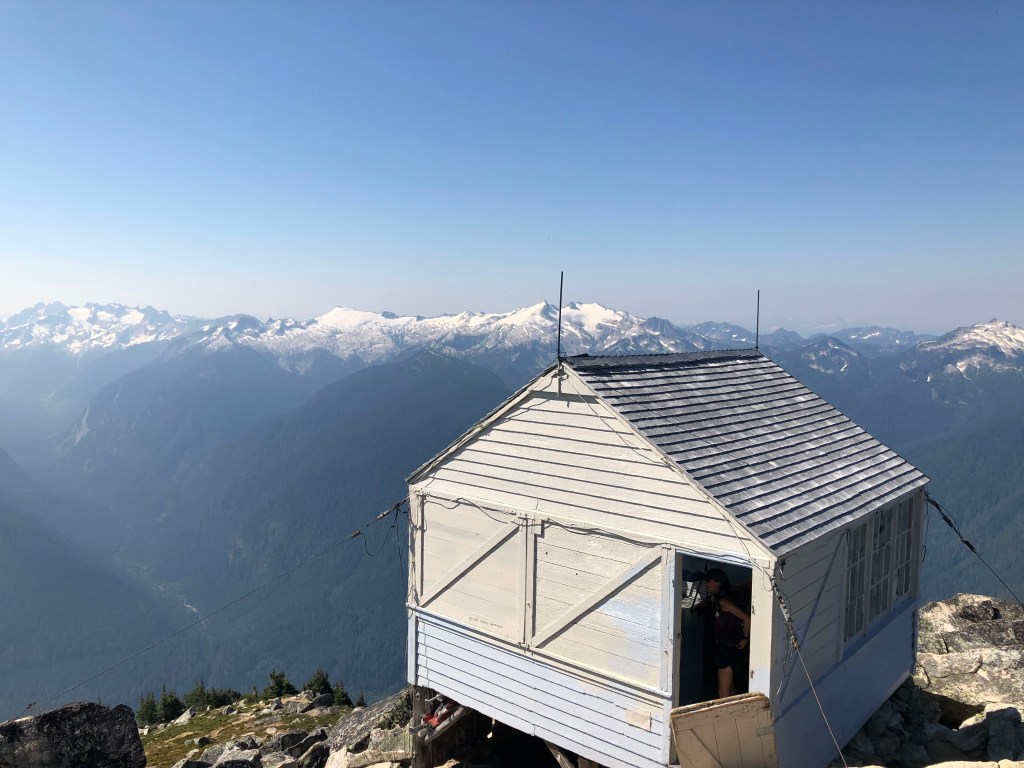 Up to this point we had only seen two people who were finishing their hike as we were starting ours. A short climb up some talus to the Hidden Lake Peak, we met Tom. He stayed the previous night in the cabin and told us about the crazy night he had surviving the thunderstorm. He’s the one who called in about the smoke from a new fire, likely caused by the storm.