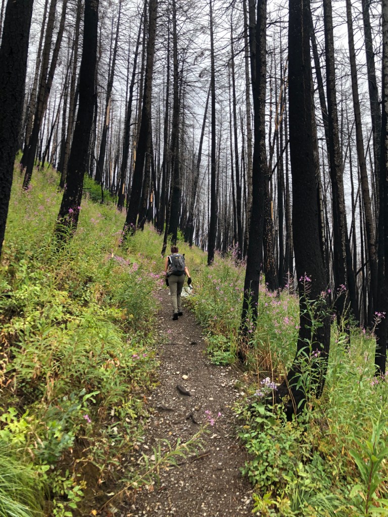 We chose to hike to the Mt. Brown Lookout because it offered over 4,000′ of gain in about 10 miles. We took a left onto the Mt. Brown Trail from the Gunsight Pass Trail; had we continued we would have eventually reached the Sperry Chalet, which was severely burned in the Sprague fire the summer of 2017.