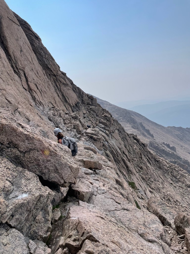 We were so grateful that the next section of the hike was marked by spaced-out bulls’ eyes on the rocks. This alleviated some of the stress of route-finding that tripped us up on our Wilson Peak hike. We traversed this part with trepidation because the exposure was more than we were used to; there was a many-thousand-foot drop-off, so we were vigilant with every step. I actually really liked this part, though. The next section, however, I could have done without.