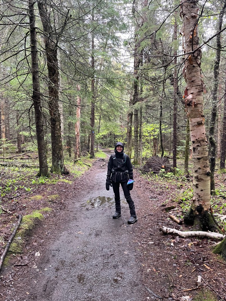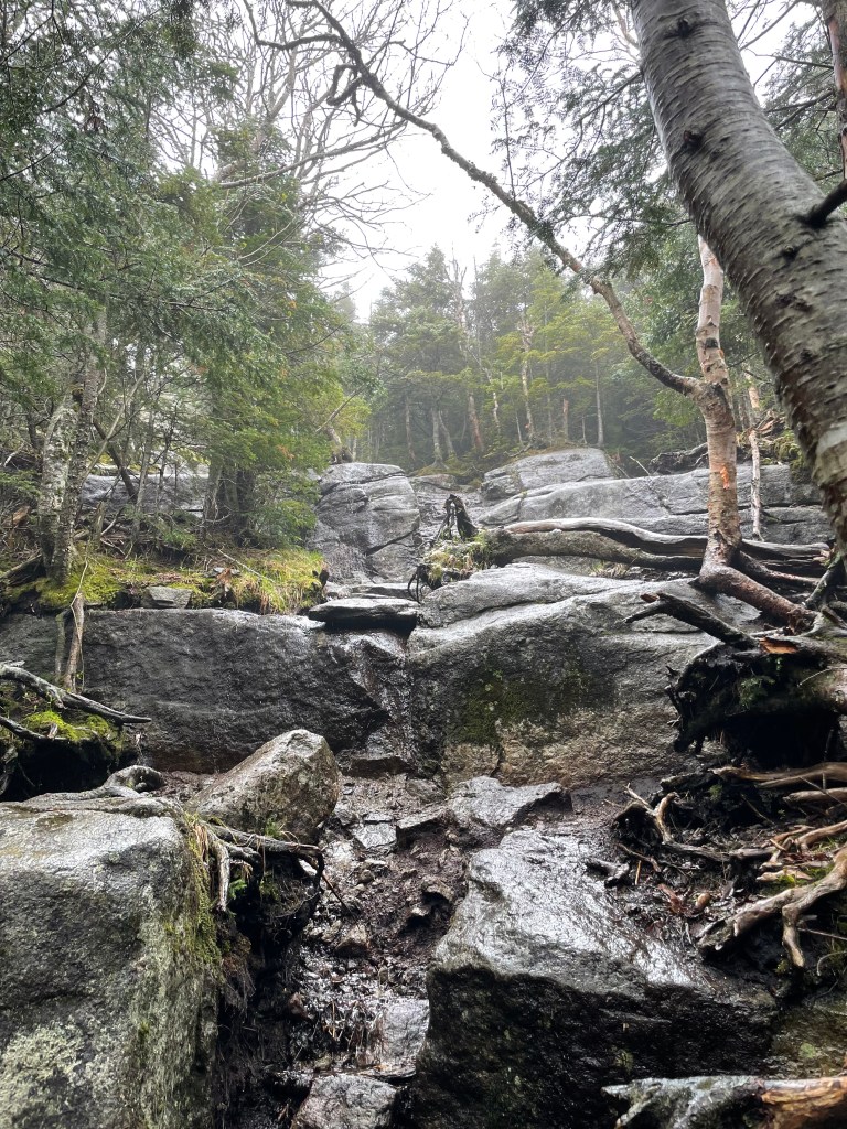 The next mile or so there’s minimal gain. We had fun moving from rock to rock to avoid running water and mud on the trail. We took Phelps Trail to reach Phelps Mountain. Most of the gain was in this 1.2 miles of rock hopping because the trail was a literal stream. We were happy to be wearing our winter boots. The trip back was uneventful, and we looked like you would expect in a day of constant rain and mud. Because of the weather, the trails were not as crowded and there were no bugs. Silver linings!